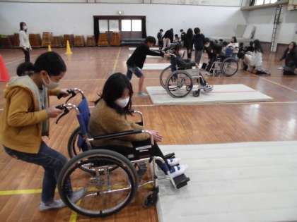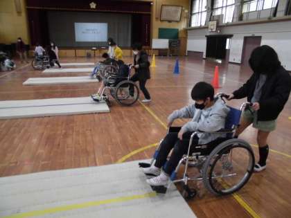 車いす体験をした後、動画を視聴しました。日常生活で車いすを利用している方のお話を聞きました。いろんな経験談を聞きながら、自分の体験をふり返りました。教室に帰ってから、ふり返りの用紙にたくさんの感想を書いていました。