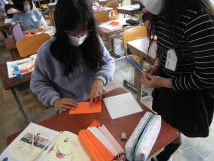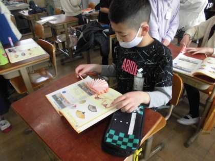 扇を作っている中で,自然と友達と話合い,作り方を確認する姿が見られました。