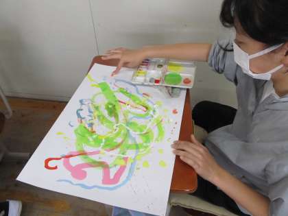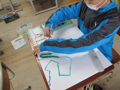 図工では、「音のする絵」を描いています。雨の音、風の音、何かがはじける音、いろいろな音のイメージを絵にしています。絵の具だけでなく、クレパスや画用紙なども使って、自分の思い描くものになるように頑張っています。