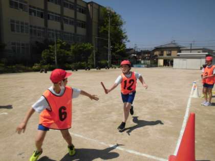 リレーの学習で,バトンパスの練習をしています。