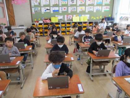 GIGA端末を起動してログインしました。みんなわくわくしながらGIGA端末に向き合っていました。ログインが難しくて苦戦している子もいましたが、できた子がまだの子に教えてくれる姿も見ることができ、微笑ましかったです。