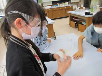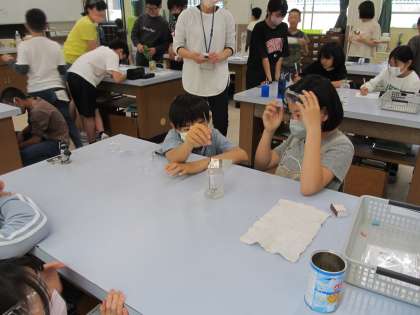 ものの燃え方の実験では、ろうそくをびんの中で燃やし、燃えたあとの気体を調べました。