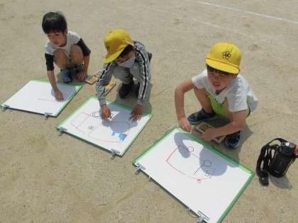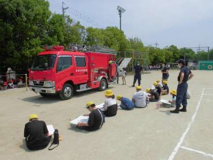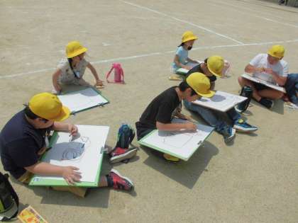 火災の避難訓練の後、訓練に来てくれた消防車を写生しました。ホースやメーターなど、たくさん付いている器具を見て、画用紙に描き写していました。