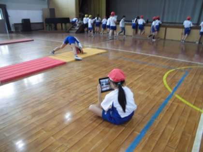 できない技を完成させるために、友達に動画を撮ってもらったり、アドバイスをし合ったりして、熱心に取り組んでいます。