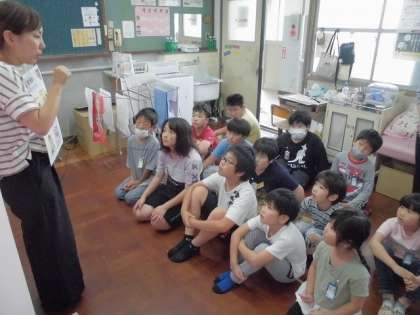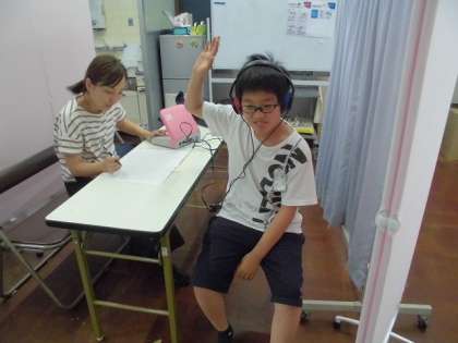 保健室の先生に聴力検査をしてもらいました。音が聴こえたら手を上げて、聴こえなくなったら手を下すことなど、検査の方法を教えてもらいました。ヘッドホンを付けると、みんな真剣な表情で、集中して検査を受けていました。