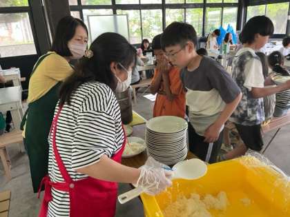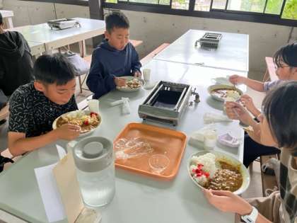 子どもたちは自分でご飯の量を選んでよそってもらっています。