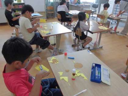 花壇にヒマワリが元気に咲いていたので、8月のカレンダーはヒマワリの花を作って仕上げました。花びらをたくさん切って、隙間なく貼り付けました。夏らしいカレンダーになりました。