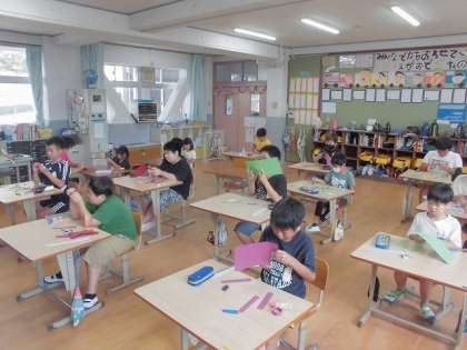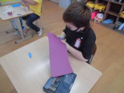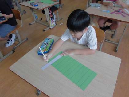 ぶどう作りで、紫や黄緑の画用紙に定規を使って線を引き、ハサミで切りました。できた短冊を輪にしてぶどうの粒を作り、それをつなげて房にしました。定規もハサミも上手に使って作っていました。