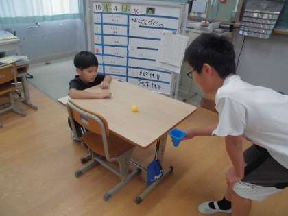 自立活動の時間に、ビジョントレーニングの一つ『ころころキャッチ』をしました。転がってくるボールを落とさずカップでキャッチします。ボールの動きを眼で追って取ることで、眼の動きや眼と手の連動をトレーニングします。友だちと楽しみながら活動していました。