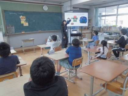 ALTの先生と一緒に英語の学習をしました。10月31日のハロウィン行事について教えてもらいました。歌やクイズもしました。クイズは大盛り上がりでした。