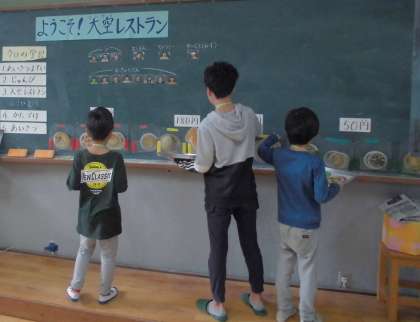 セルフ式のレストランの流れで、店員と客の役に分かれ、レストラン遊びをしました。お客さんに挨拶をしてトレーを渡したり、食べたいメニューを選んでレジに行き支払いをしたり、大空レストランは大賑わいでした。