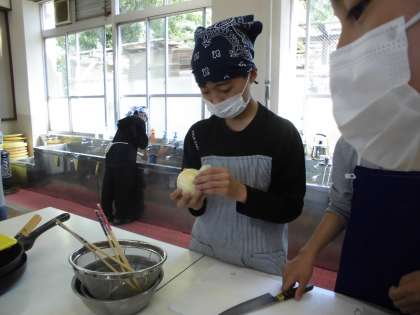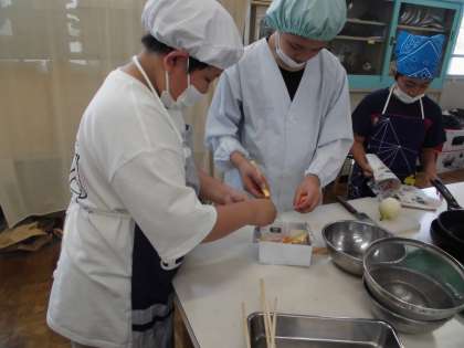 今回は、野菜のベーコン巻き、豆腐と野菜のチャンプルー、ベーコンポテトの3種類から作りたいものを選び、グループで協力、分担して作りました。