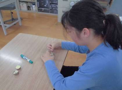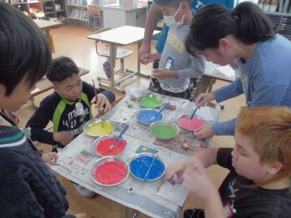 畑で収穫したさつまいもを使って、低学年は型抜きをしてハンコに、高学年は好きなマークを彫ってハンコを作りました。出来上がったものを紙いっぱいに押していました。