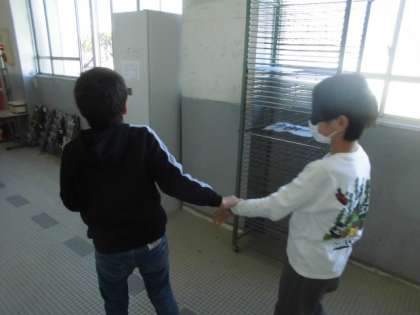 総合の学習で、目が不自由とはどういうことなのか、アイマスクを使って体験しました。