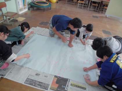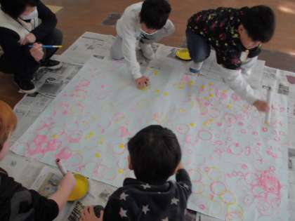 『小人のくつや』を題材に、版画に取り組みました。小さな巨匠展では、個人作品として展示します。校内作品展では、合同作品を展示するので、合同作品の台紙づくりをしました。グループに分かれて、ピンクや黄色、白色でスタンピングをしました。校内作品展をお楽しみに。