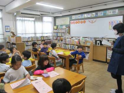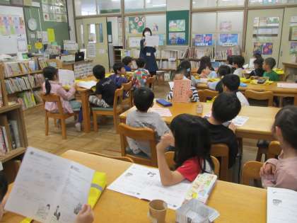 学校図書館に行き、司書教諭の池端先生に図書館の使い方、本の借り方、返し方を教えてもらいました。