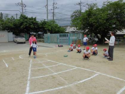 体力テストの一つ、ソフトボール投げをしました。最初に準備体操をし、腕を回して、気合も十分。力いっぱい投げていました。