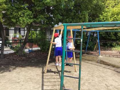 雲梯などを使って遊具遊びをしています。
