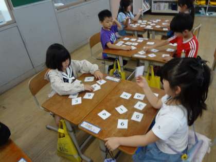 今回は、カードを使って10にするためにはあといくつ必要かを考えたり、おはじきゲームをして、6このおはじきのうち、いくつ入って、いくつ入らなかったのかを考えました。