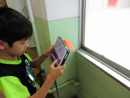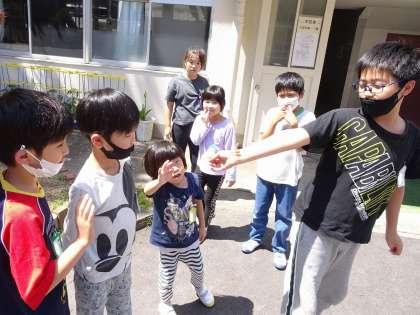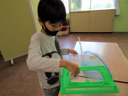 プールで捕まえたヤゴが羽化してトンボになり、写真を撮って観察しました。虫かごでしばらく過ごし、外へ放しました。空高く飛んでいくトンボをみんなで見送りました。
