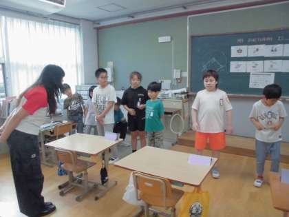 1月から12月の英語を学習し、ALTの先生に教えてもらいながら、自分の誕生日を英語で言いました。その後、友だちの誕生日をたずねて、誕生月の順番になるようにみんなで並びました。