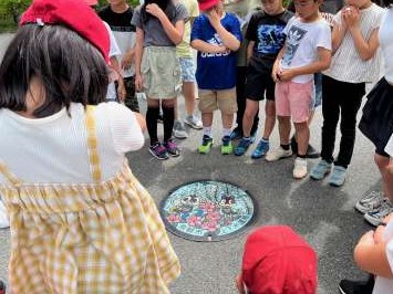京都上下水道のキャラクター、すみとくんとひかりちゃんがかいてある可愛らしいデザインのマンホールを見せていただいたり、水の流れをわかりやすく見せてもらいました。下水道の大きさに驚いていました。