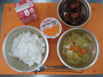 カリッと揚がった鶏肉を,さとう・トマトケチャップ・ウスターソースで味付けします。甘辛い味がご飯とよく合い,残菜も殆どありませんでした。