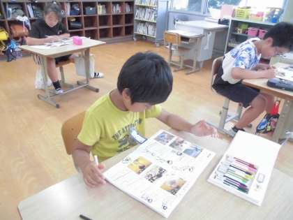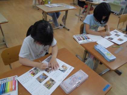 1学期の学校生活をアルバムにまとめています。写真を選んで貼り、「ヤゴをとった。いっぱいいた。」や「畑の野菜とった。」など、学習がどうだったか振り返りながら、コメントを書き入れていました。
