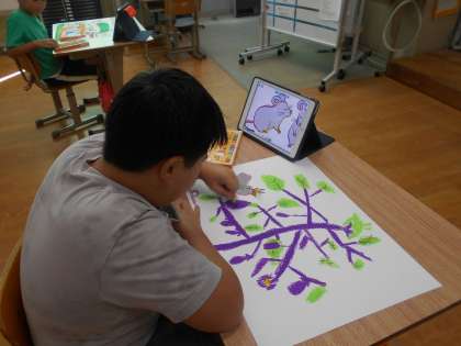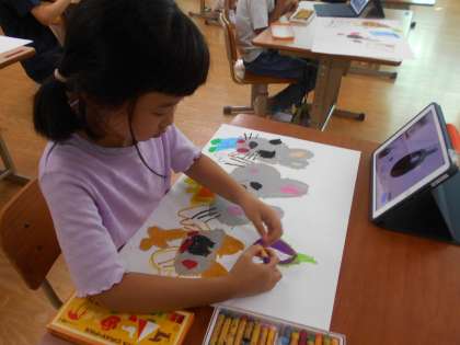 絵本のお話を聞いて、好きな登場人物や場面を絵に描きました。「ネズミをかこう」、「タンポポは黄色だよ」など、クレヨンで丁寧に塗り込んでいました。