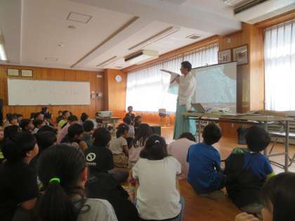 菱妻神社の宮司さんをゲストティーチャーに招き、神川校区の昔のことや菱妻神社のこと、千種囃子のことなどを聞きました。