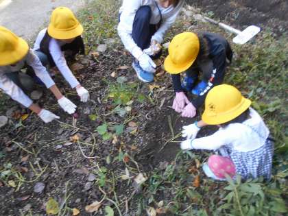大空の畑で育てていたサツマイモをみんなで掘りました。今年は不作で、小ぶりで数も少なかったですが、子どもたちは「あった!」「まだないかな?」と楽しみながら掘っていました。