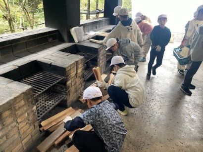 カレーライス作りが始まりました。みんなで協力して薪組み、野菜切り、お米研ぎ みんなで協力して進めています。