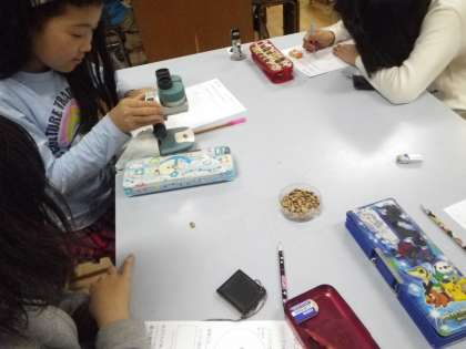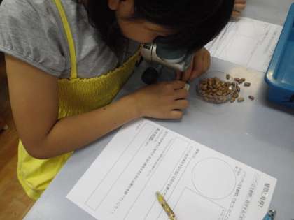 虫眼鏡や顕微鏡を使ってインゲン豆の種を観察しました。