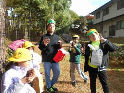 森林総合研究所に行って、木や生き物のことなど自然について教えてもらいました。展示学習では、いろいろな木の年輪を顕微鏡で見たり、木の種の飛び方を紙で再現したりして、学習しました。キツネやタヌキのはく製にも触り、大興奮でした。その後、外で松ぼっくりやドングリなど、いろいろな木の実を拾いました。木の名前や実の特徴なども教えてもらいました。大きな松ぼっくりやたくさんのドングリを拾って大喜びでした。