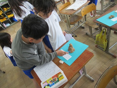 図画工作「にぎにぎ ねん土」の2回目は、作った作品の鑑賞会をしました。
