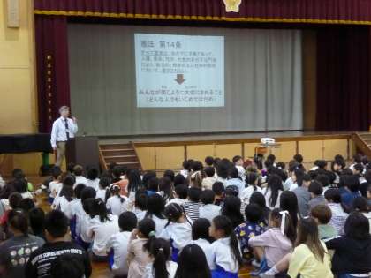 5月は憲法月間なので、校長先生から日本国憲法についてお話があり、絵本の読み聞かせを通して、みんなが同じように大切にされること、どんな人でもいじめてはだめだと子どもたちに伝えて下さいました。