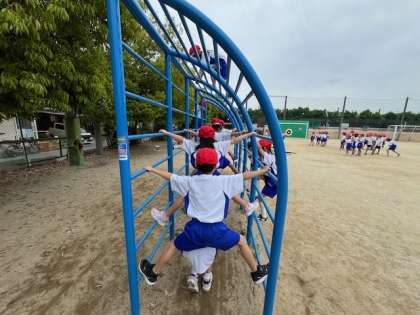体育科では鉄棒あそびと遊具あそびをしています。鉄棒あそびでは、友だちと楽しみながら、いろんな技に挑戦しています。こうもりやつばめ、ちきゅうまわりなど、できる技からどんどんやっています。