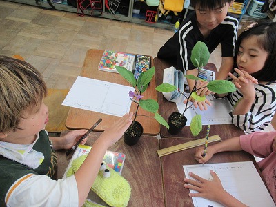 国語科「かんさつ名人になろう」の学習で、明日の生活科で畑に植える野菜の苗を観察しました。
