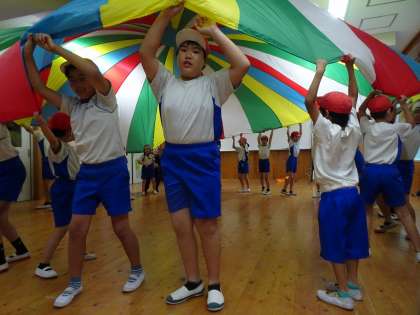育成合同運動会に向けて、久我の杜小学校のたいよう学級と一緒に、パラバルーンの練習をしました。音楽をしっかりと聞き、周りの友だちの動きを見ながら、息を合わせてパラバルーンを動かしていました。
