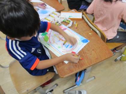 図画工作では、次の単元でクレパスを使って絵を描くので、改めて、クレパスの使い方をみんなで確認しました。