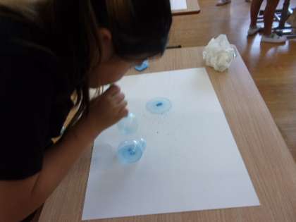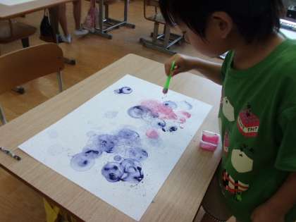 図画工作の「お話の絵」では、お話のイメージに合った背景を作るために、様々な色を付けたシャボン玉を画用紙に飛ばして色を付けました。幻想的な背景に仕上がりました。