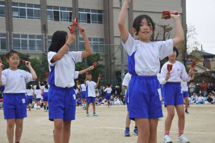音楽に合わせて鳴子を鳴らしながら踊りました。