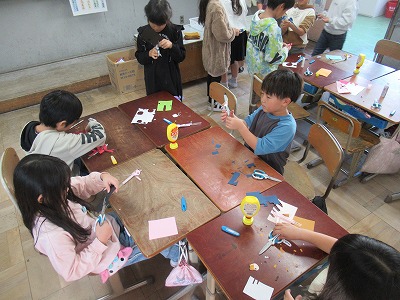 子どもたちは画用紙を上手に切り貼りしながら、動きに合わせたものを作っています。