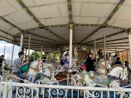 遊園地では、グループ毎に別れて色々な乗り物に乗っています。