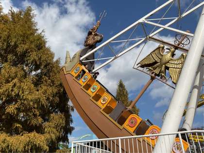 遊園地では、グループ毎に別れて色々な乗り物に乗っています。