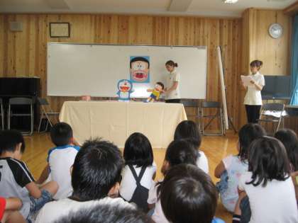 はじめに,歯みがきの大切さを人形劇で学びました。