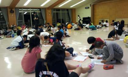多目的ホールで夕べのつどい・今日の反省をしています。明日もがんばろう!