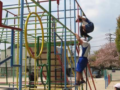 これまで休み時間には滑り台の所までは行ってはだめでした。体育の授業で何度も何度も練習して,のぼることができるようになりました。ドキドキ,ワクワク。