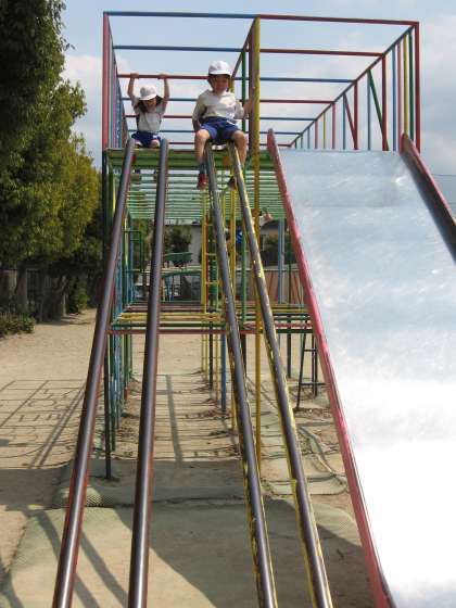 2年生になって,総合遊具のてっぺんまでのぼり,念願の滑り台を滑っています。