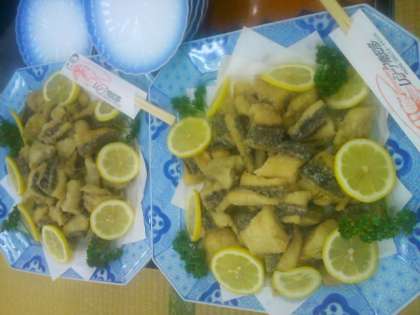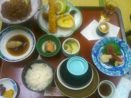 お風呂の後は楽しい夕食の時間です。ホテルのみなさんの心尽しのメニューと6年生が地引き網で捕った魚の唐揚げです。食べきれないぐらいの量です。
